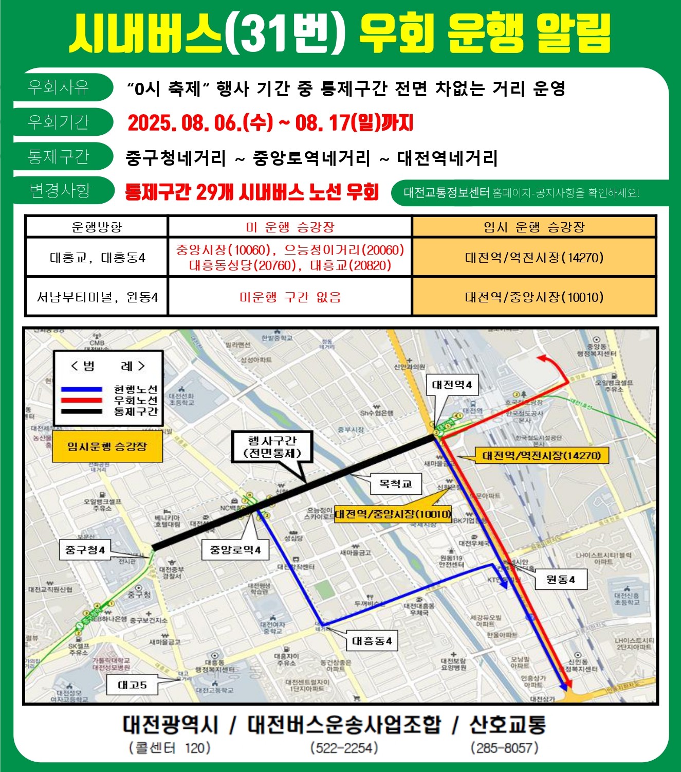 기존 중앙로 정류장들은 임시 미정차하며, 우회 구간에 설치된 임시 정류장을 이용해 주시기 바랍니다. 31번 버스의 실시간 위치와 도착 정보는 대전교통정보센터에서 확인하실 수 있습니다.
