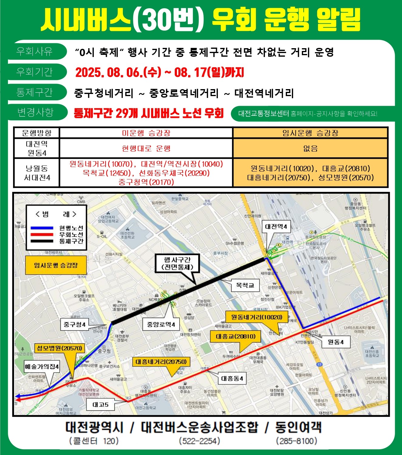 축제 기간 중 평소보다 20-30분 정도 여유시간을 두고 이용해 주시고, 궁금한 사항은 대전시 콜센터(042-120)로 문의하시기 바랍니다.